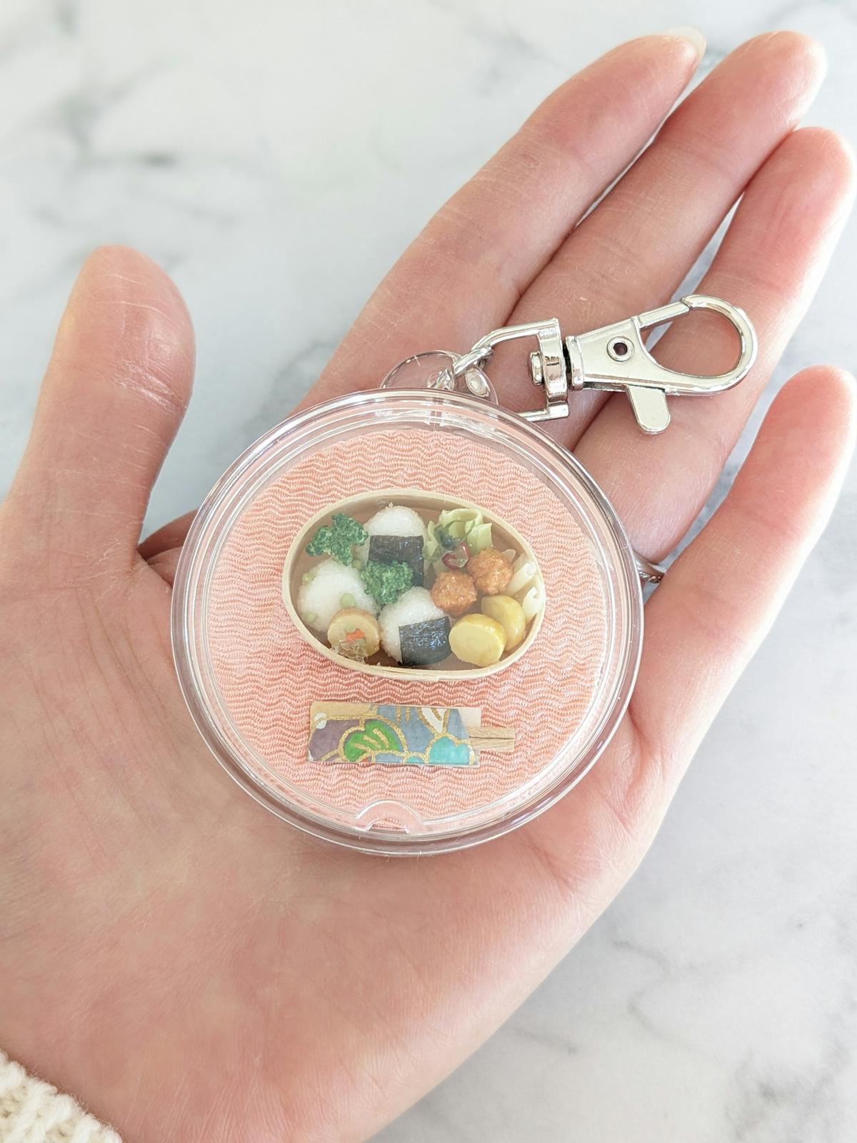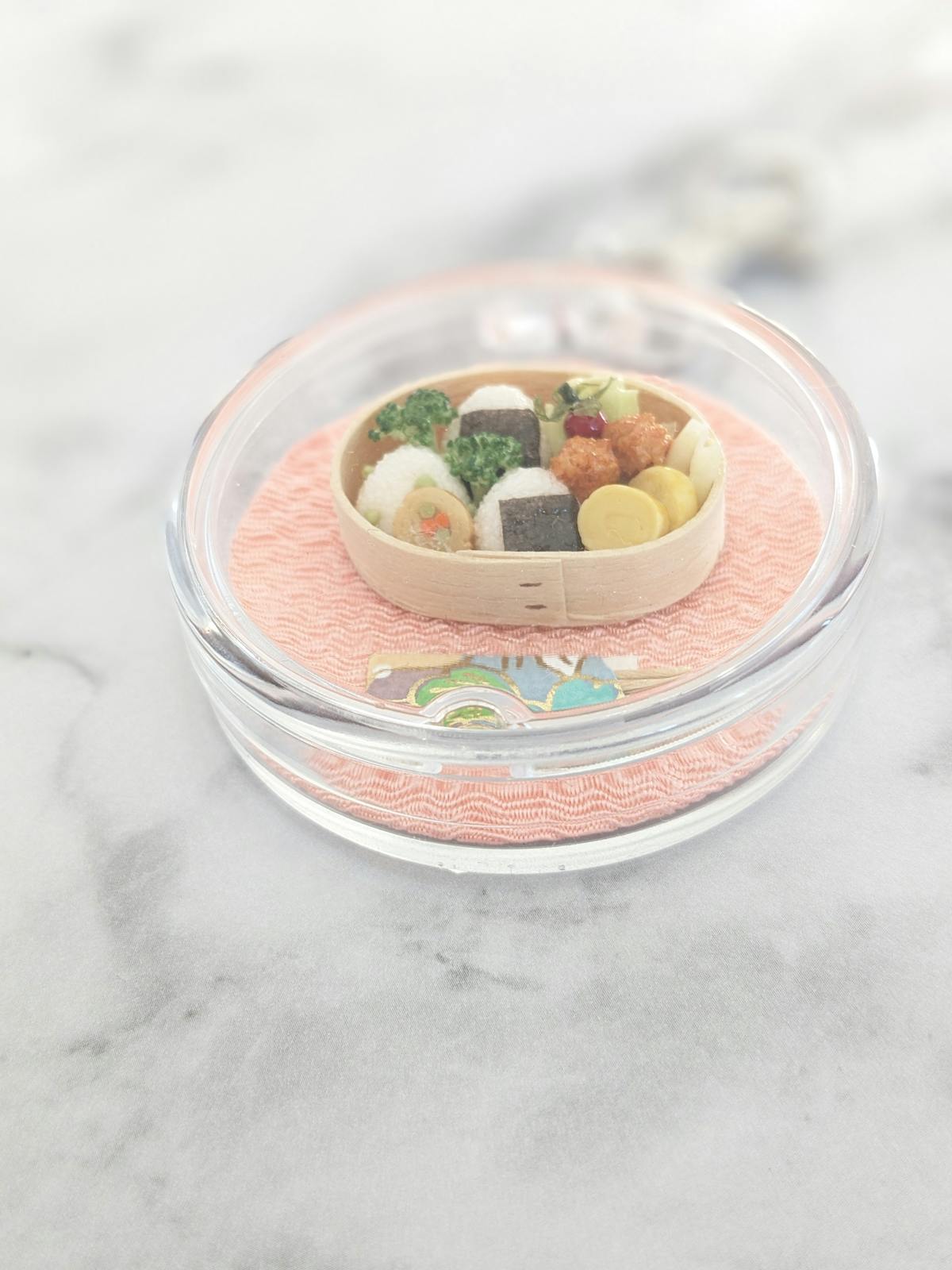 丸いクリアケースの中に曲げわっぱおにぎり弁当が入ったキーホルダーです。