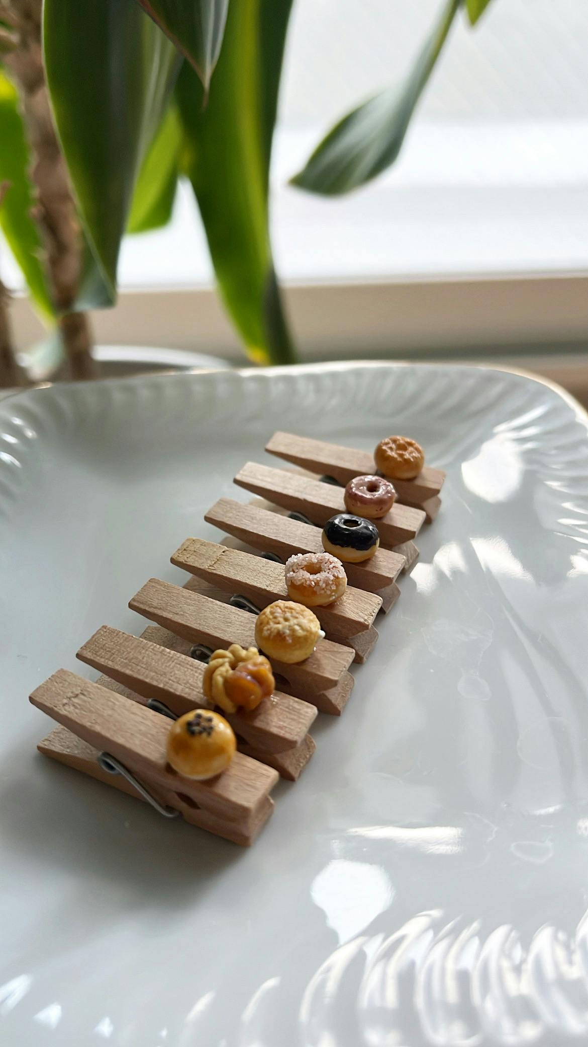 樹脂粘土で作ったミニチュアドーナツをウッドクリップにつけました。7つセットです。