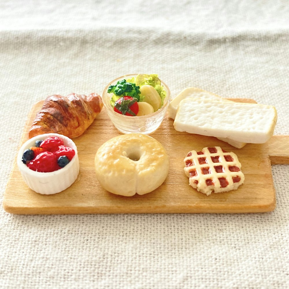 パンを沢山用意した朝食ミニチュアです✨パンなどのパーツは全て木のボードに接着済みです。