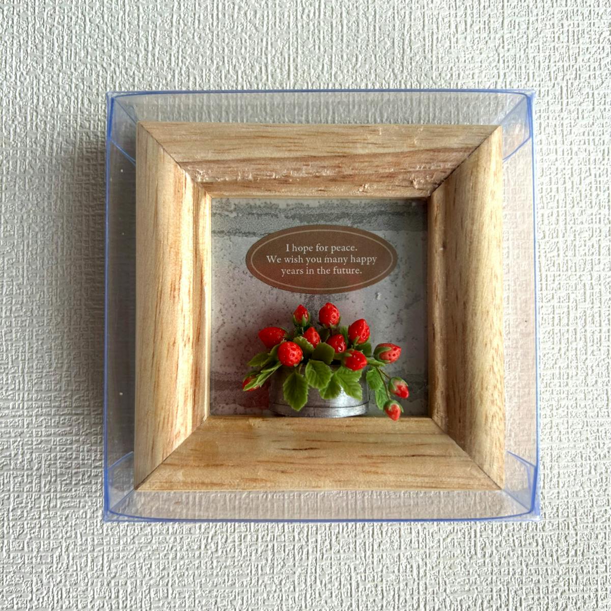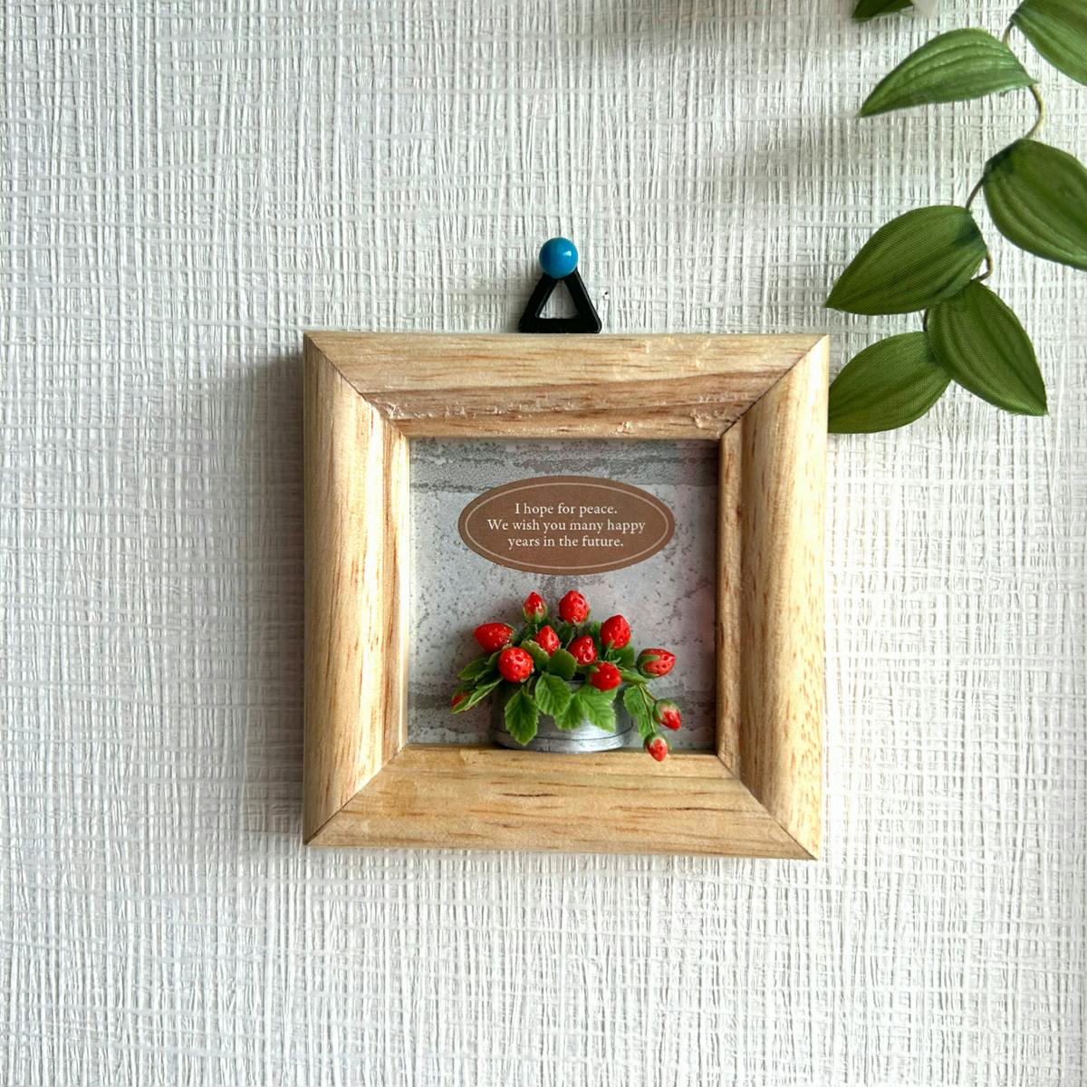 小さな赤い実がたくさん付いたいちご🍓の鉢植えをミニフレームにしました。