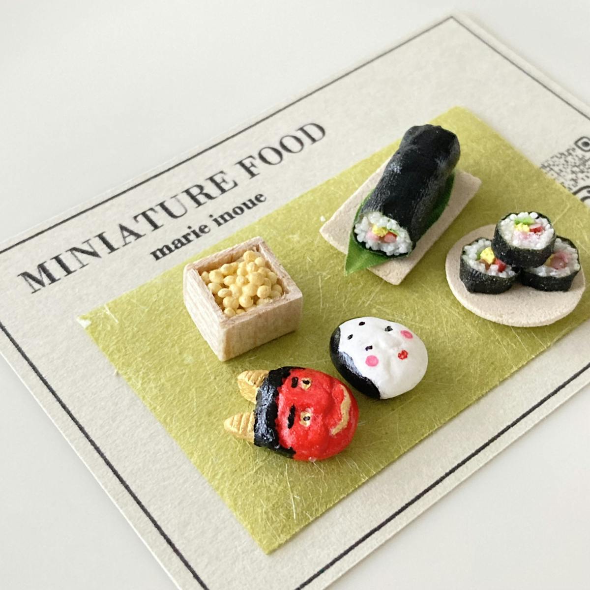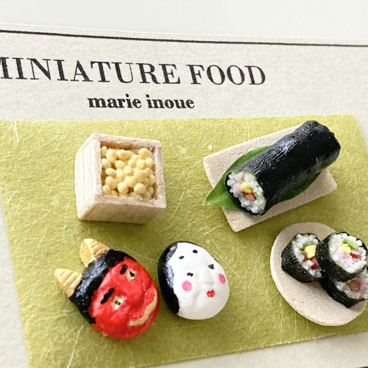 鬼とおかめのお面飾り、豆、恵方巻き2種類