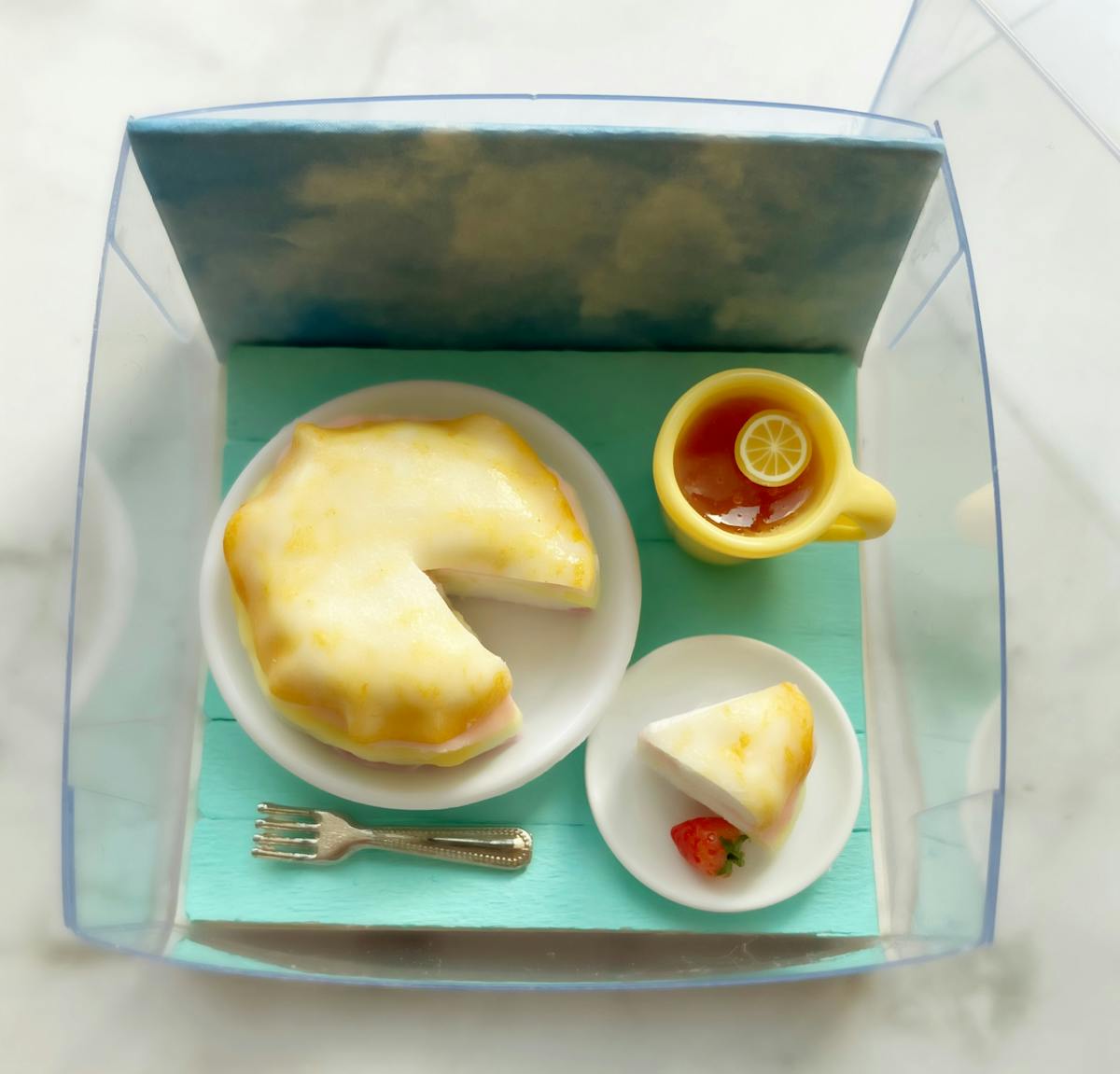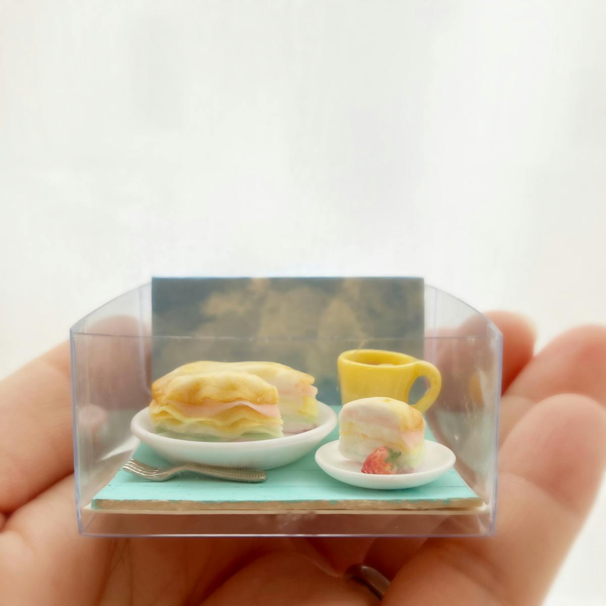 ミルクレープとイチゴは樹脂粘土で制作。リカちゃんやシルバニアファミリーのお食事などに合わせてご使用いただけます🍰