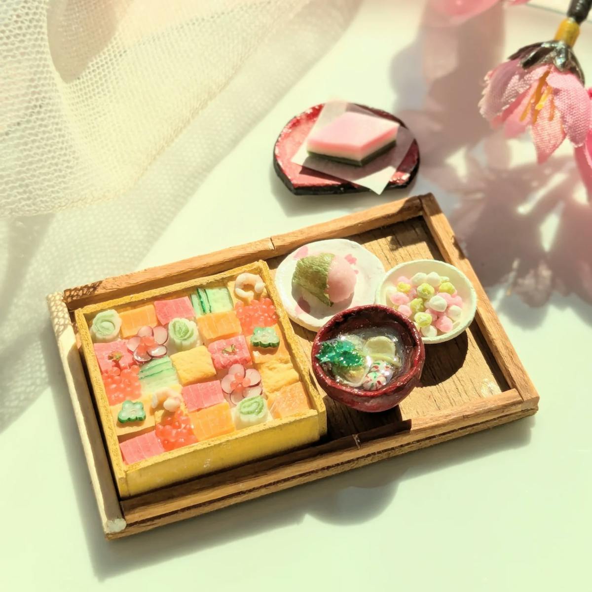 モザイクちらし寿司にはまぐりのお吸い物、桜餅に菱餅、ひなあられがセットになっています。