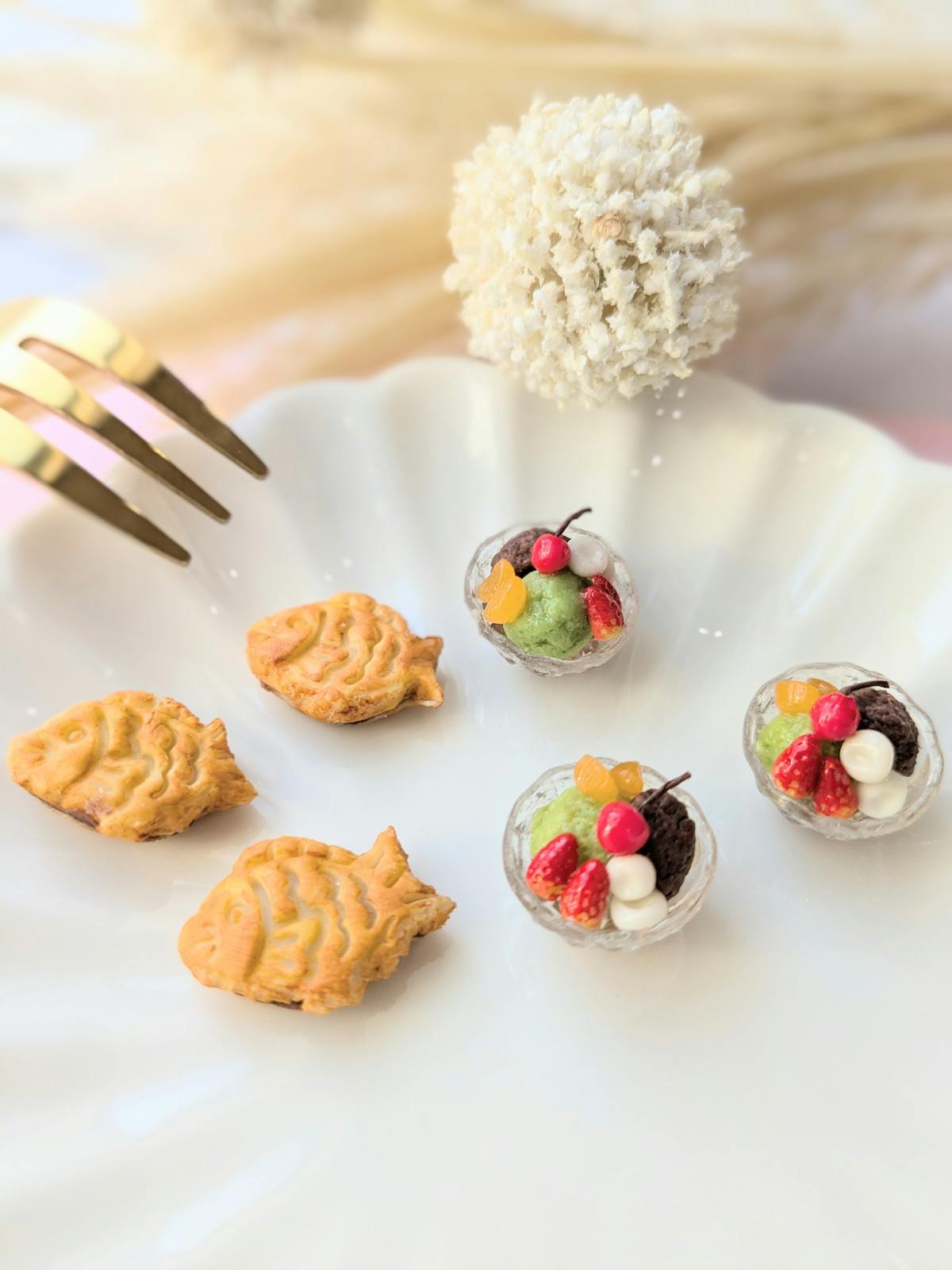 あんみつとたいやきの耳飾りです🍵🤍