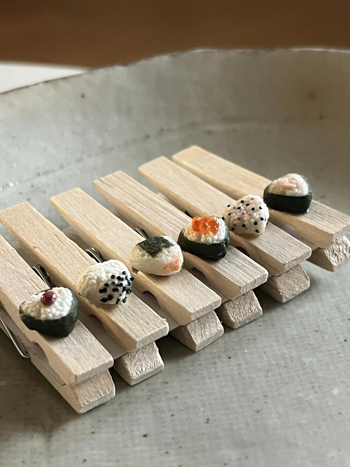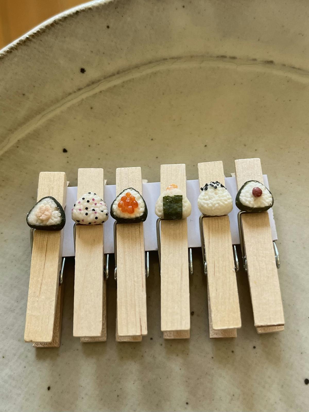 樹脂粘土で作ったおにぎりをウッドクリップに付けました。