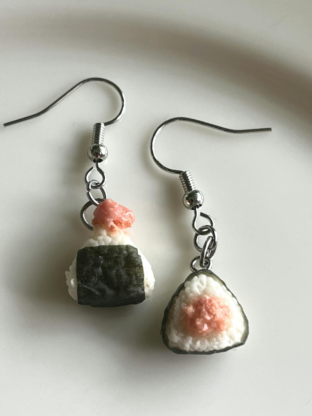 樹脂粘土で作ったタラコおにぎりのぶら下がるタイプのピアスです。