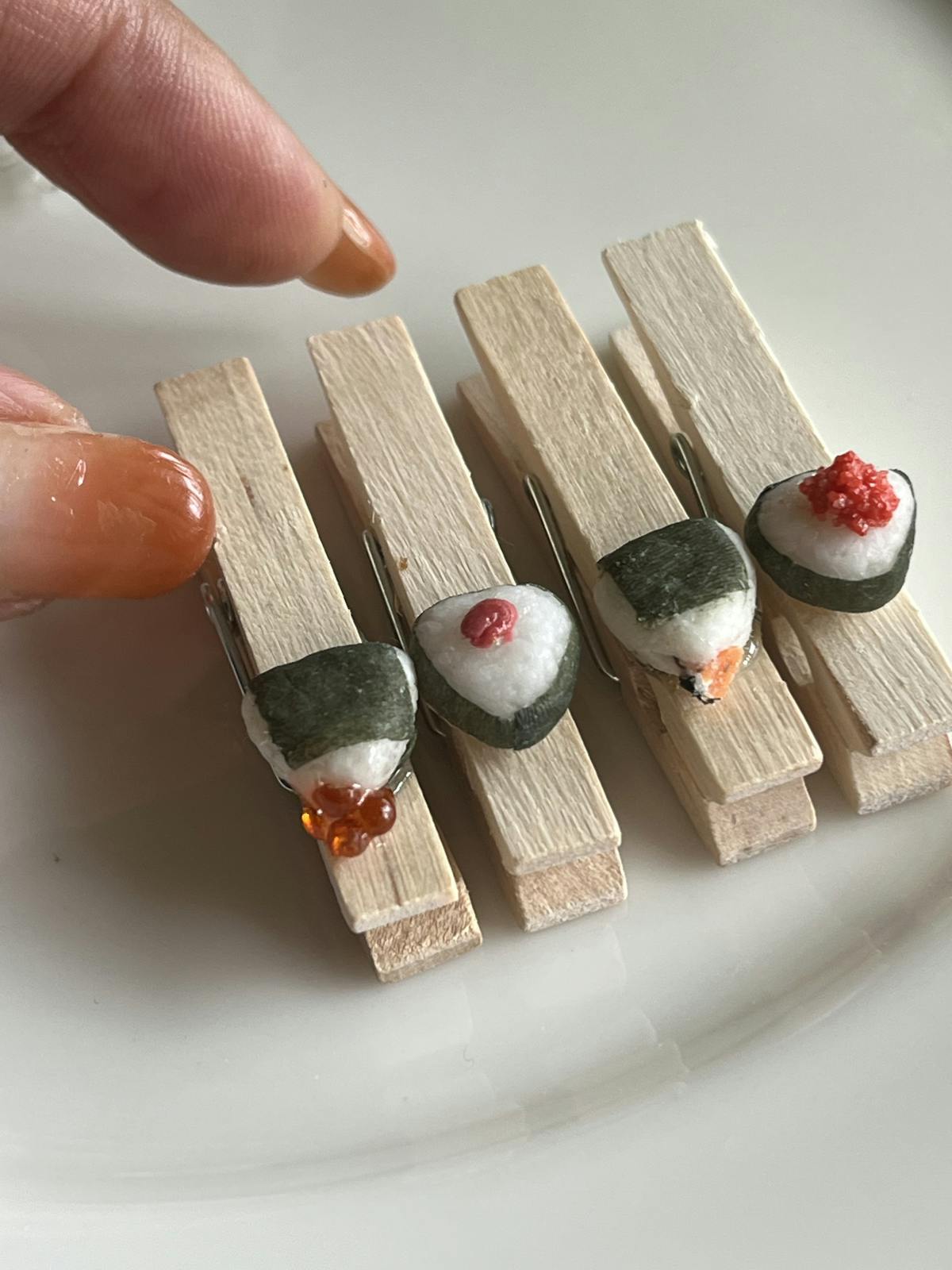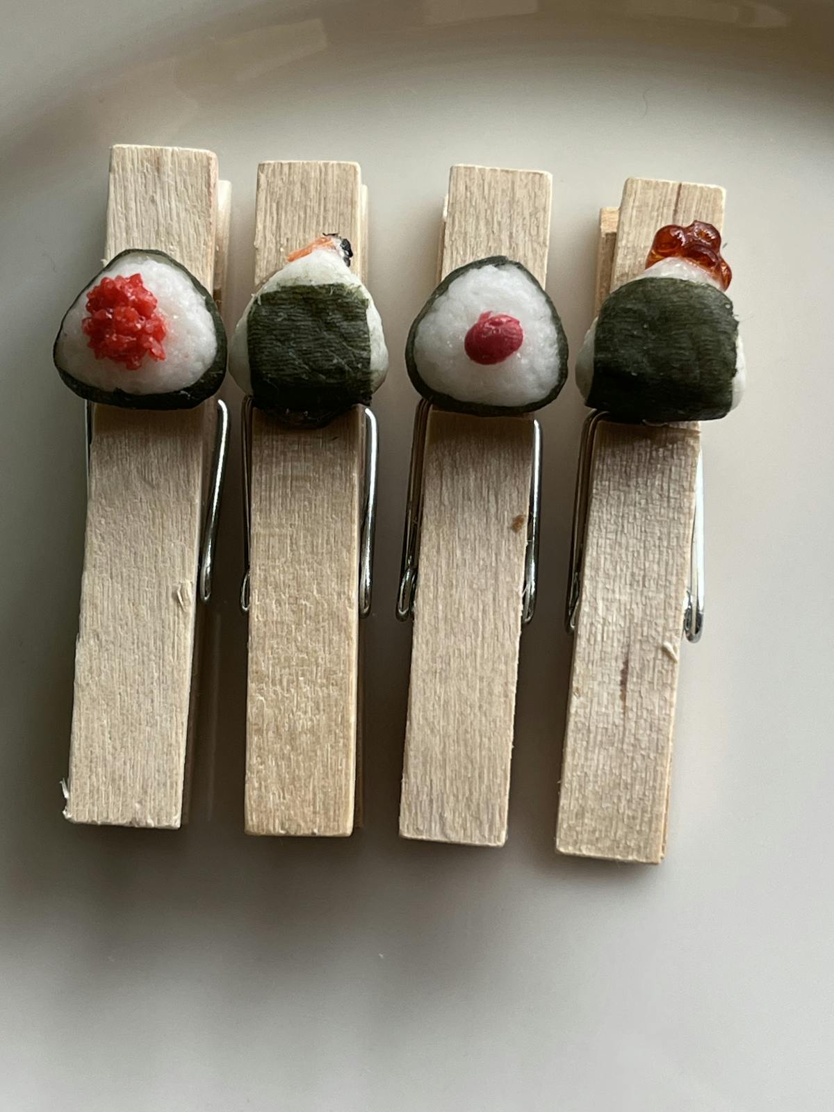 樹脂粘土で作ったおにぎりをウッドクリップに付けました。