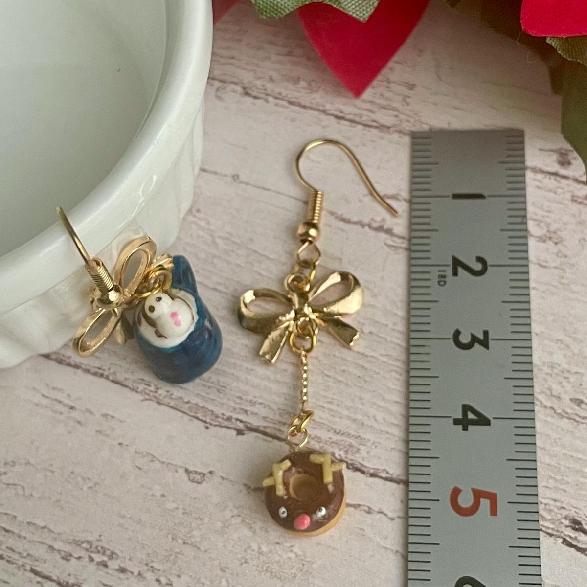 トナカイをモチーフにしたドーナツと小さな雪だるまをのせたラテのピアスです・:*+.