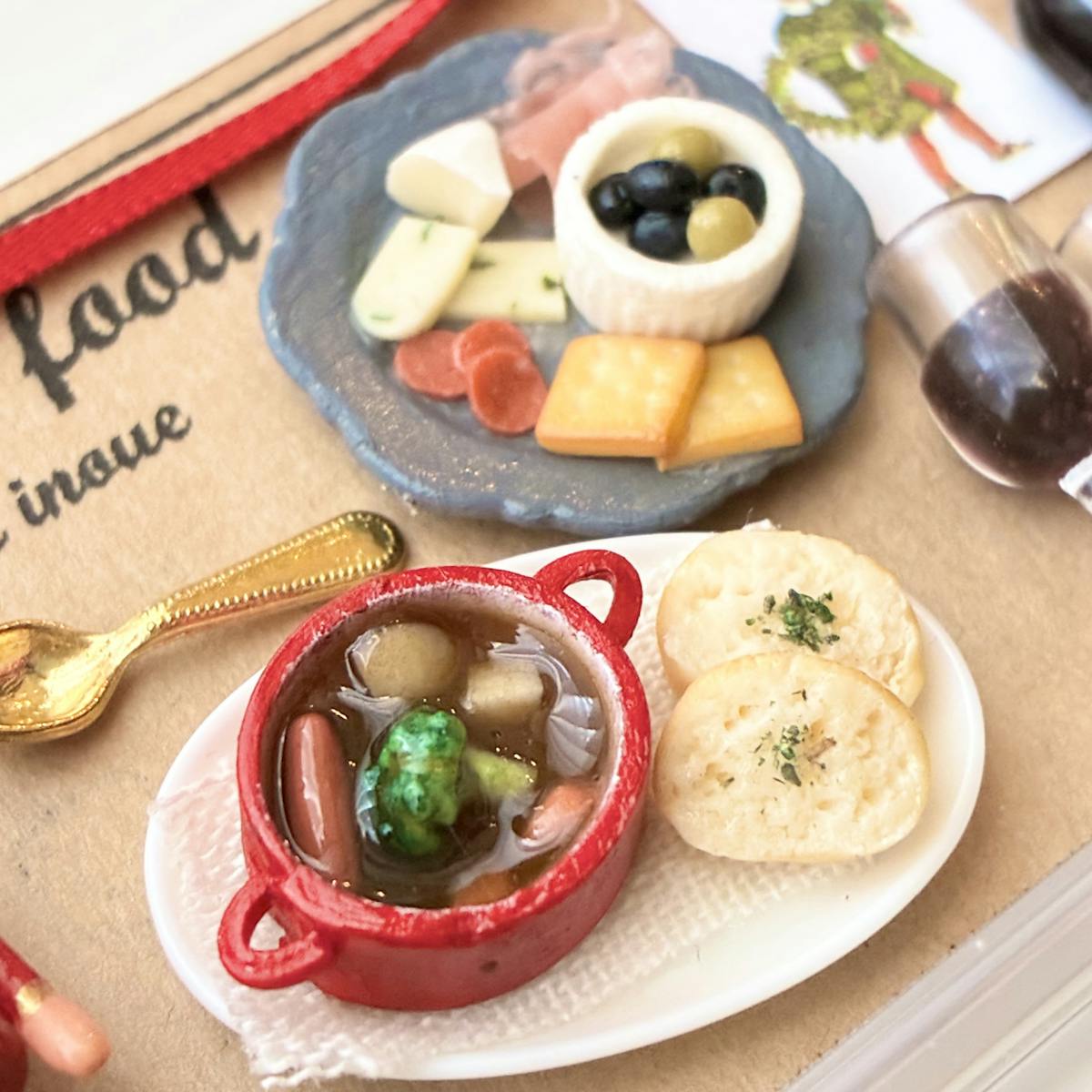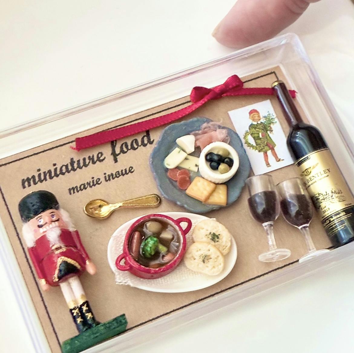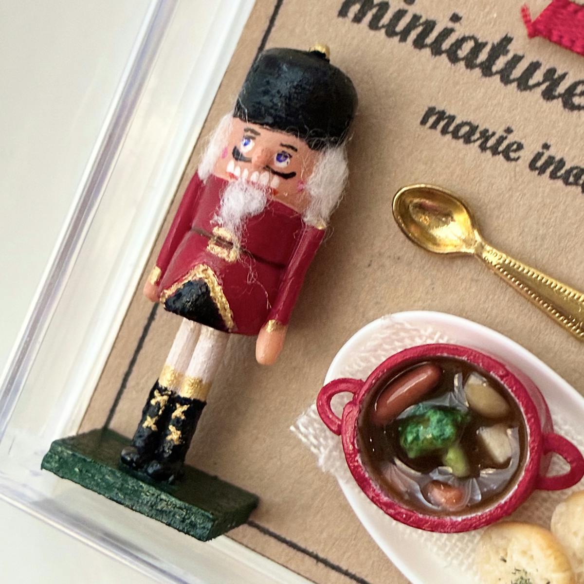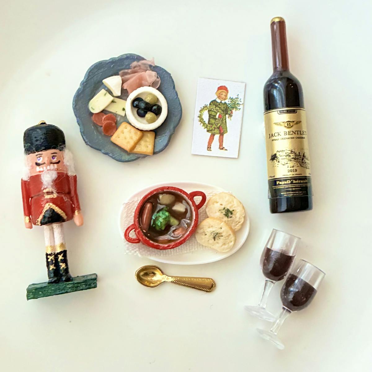 ●くるみ割り人形、チーズや生ハムのお皿、スープとバゲット、赤ワインボトルとグラス2つ、クリスマスカード、スプーン