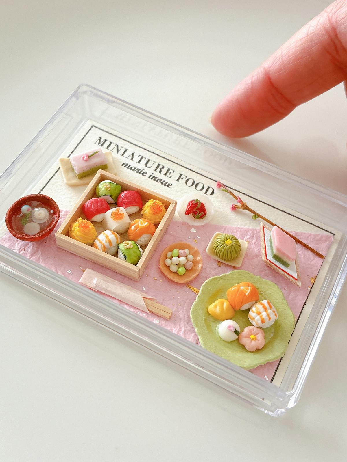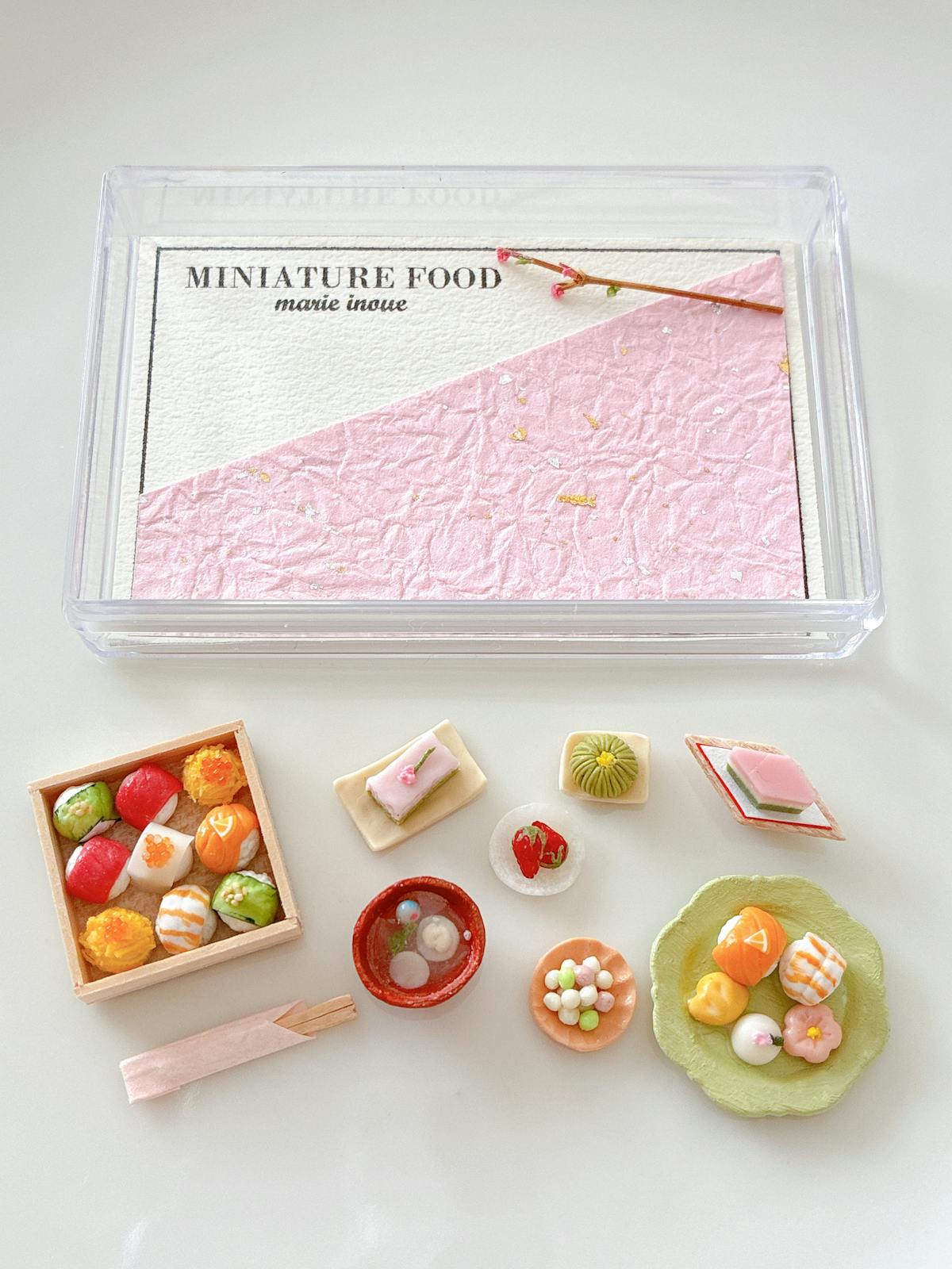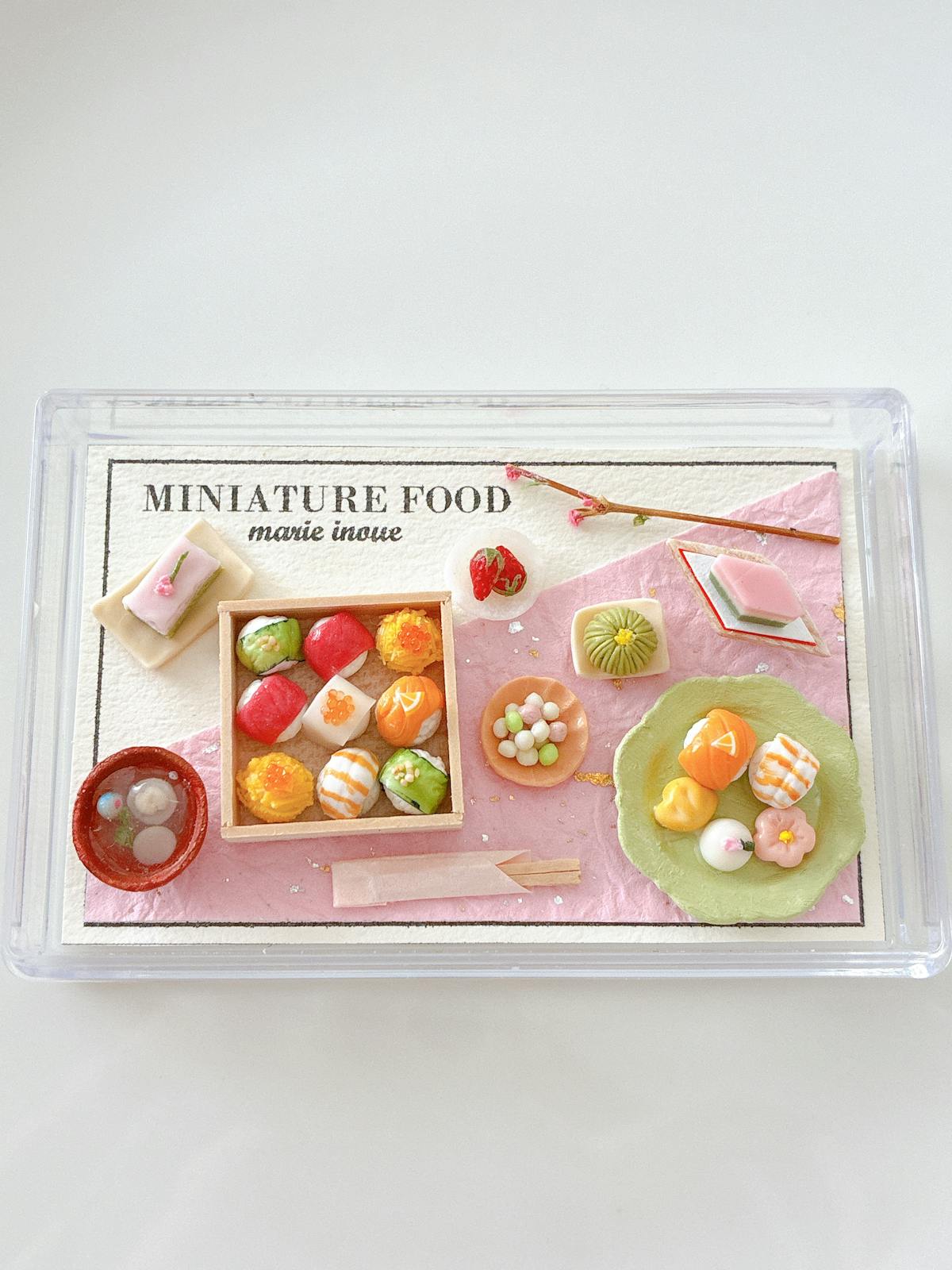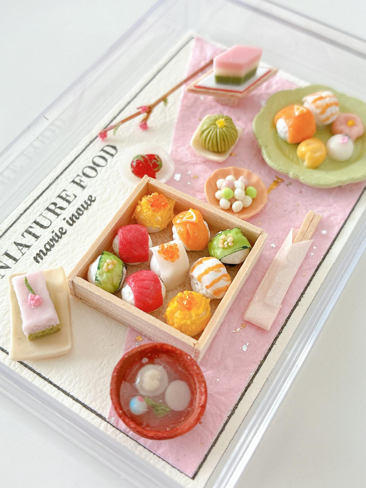 透明ケース、手毬寿司、箸、ケーキ、