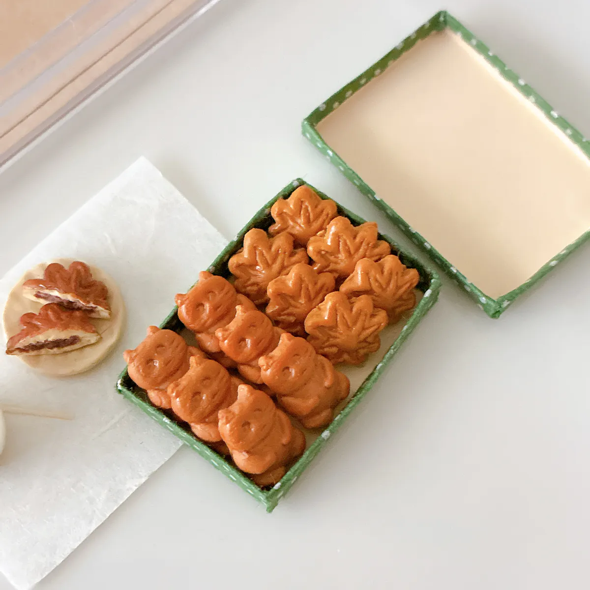 猫(狸)ともみじの人形焼きを箱に詰め、