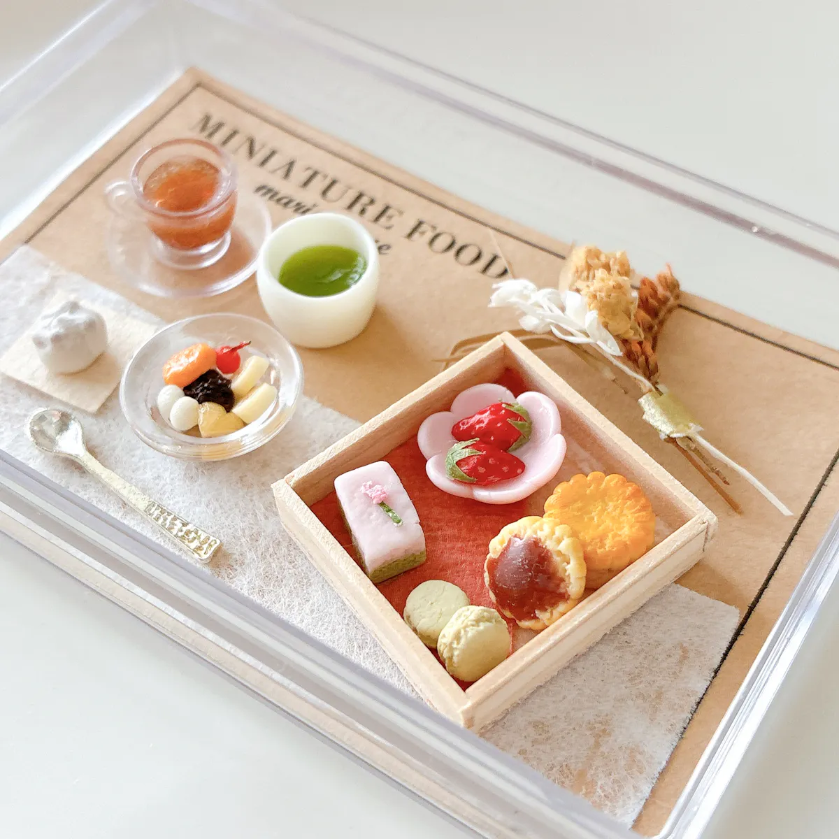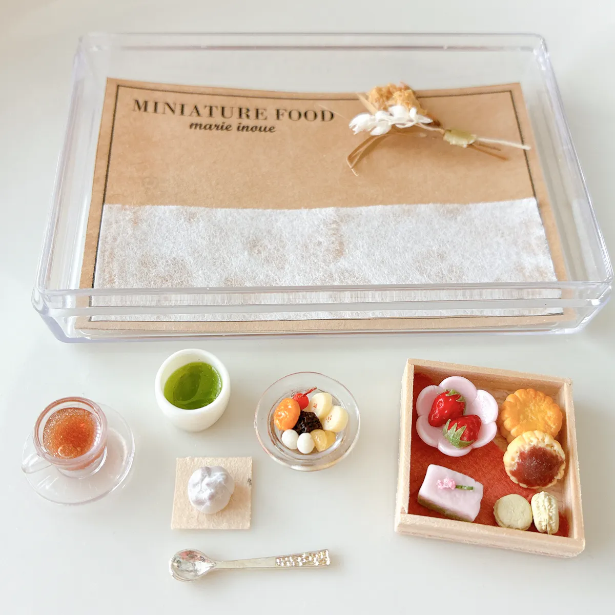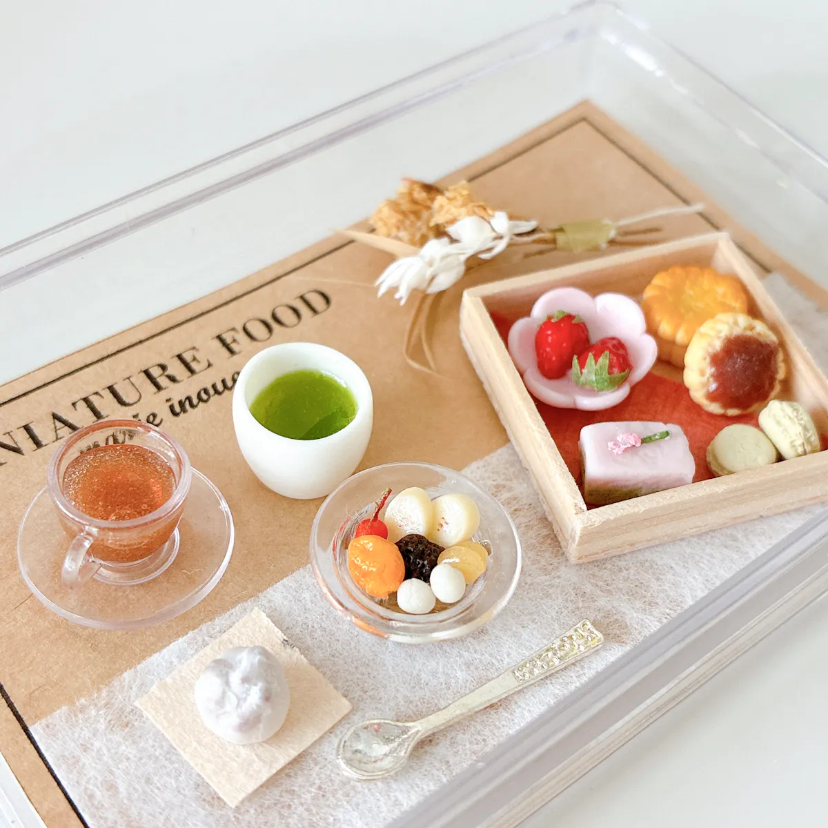 紅茶、緑茶、豆大福、あんみつ、箱に入ったお菓子4種類、ドライフラワー、スプーンを透明ケースに入れたセットです✨